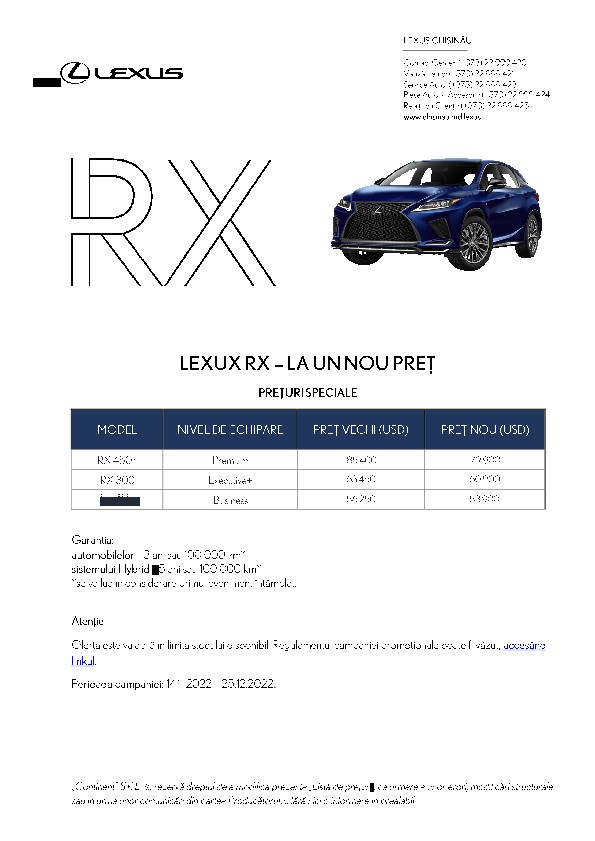 Pentru că-ți dorești un automobil spațios, puternic și sigur, „Lexus Chișinău” vine cu oferta care te avantajează financiar. Acum, Lexus RX poate deveni al tău la un super preț, cu un avantaj financiar de până la 5.500 USD.