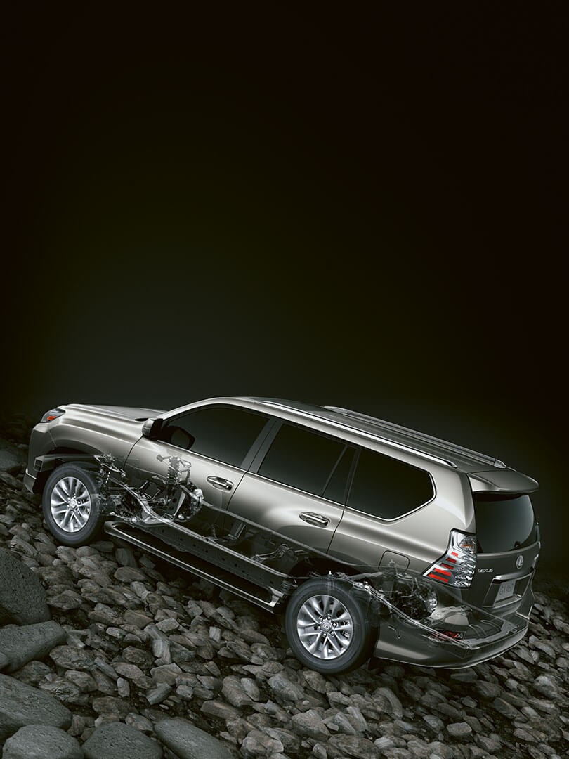 Echipa Lexus a mers mai departe, consolidând întregul schelet al GX-ului pentru o durabilitate sporită, inclusiv cu un suport adițional pentru radiator și o rezistență mărită la stâlpii din față. Capota din aluminiu, la rândul său, scade centrul de greutate, amplificând stabilitatea în teren accidentat și minimizând balansul, pentru o călătorie mai sigură și confortabilă.